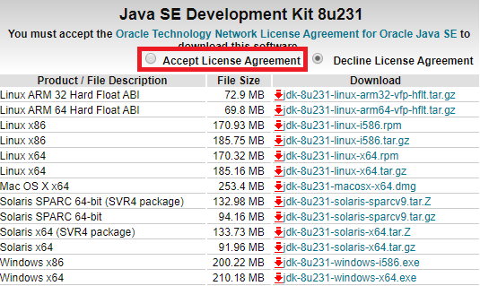 2. 'Java SE Development Kit 8u231'아래 'Accept License Agreement(라이센스 계약에 동의)'를 체크합니다.