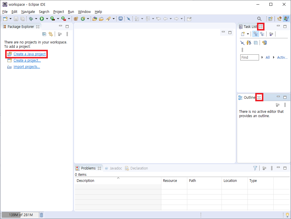 3. 우측에 'Task List'와 'Outline'은 당분간 사용하지 않으니 닫아주시고 좌측에 'Create a java project'를 클릭합니다.