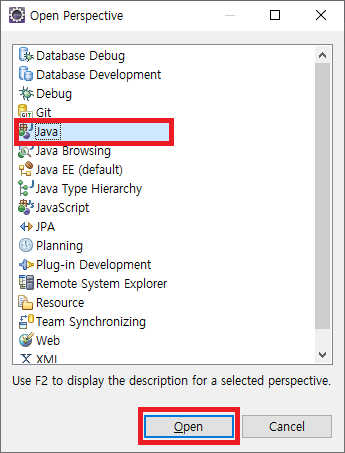 2. 'Open Perspective'창에서 'Java'를 선택 후 'Open' 버튼을 클릭합니다.
