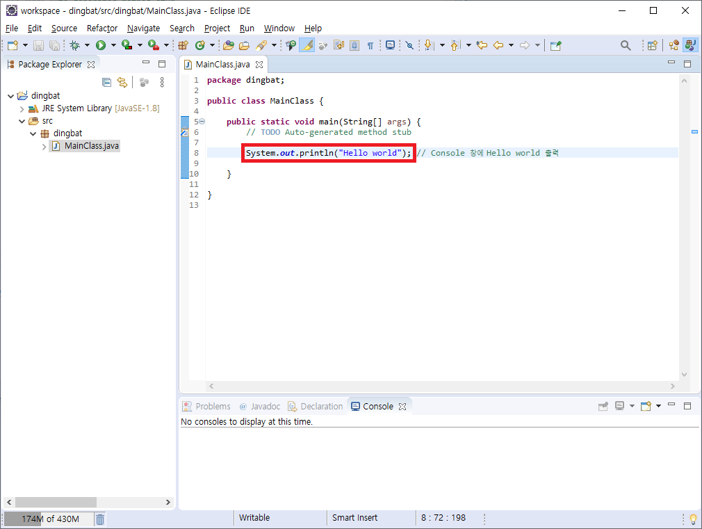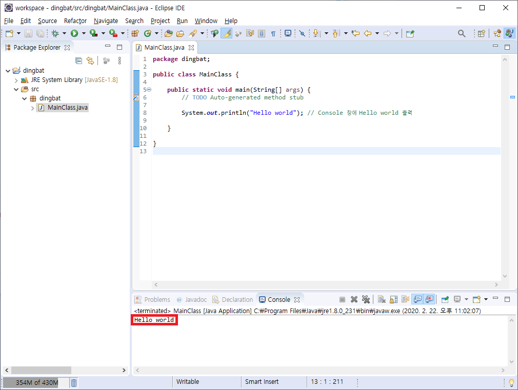 8. 'MainClass.java' 파일에서 키보드에 있는 'F11' 키를 입력했을 때 'Console' 창에 'Hello world'가 출력되는지 확인합니다.