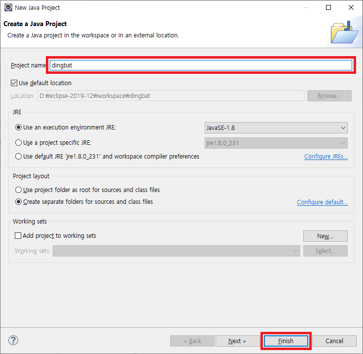 4. 'Project name'을 원하시는 이름으로 입력한 뒤 'Finish' 버튼을 클릭합니다.