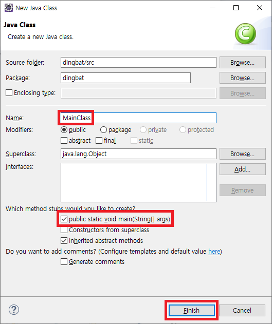 6. 'Name'란에 'MainClass'를 입력한 뒤 'public static void main(String[] args)'를 체크한 후 'Finish' 버튼을 클릭합니다.