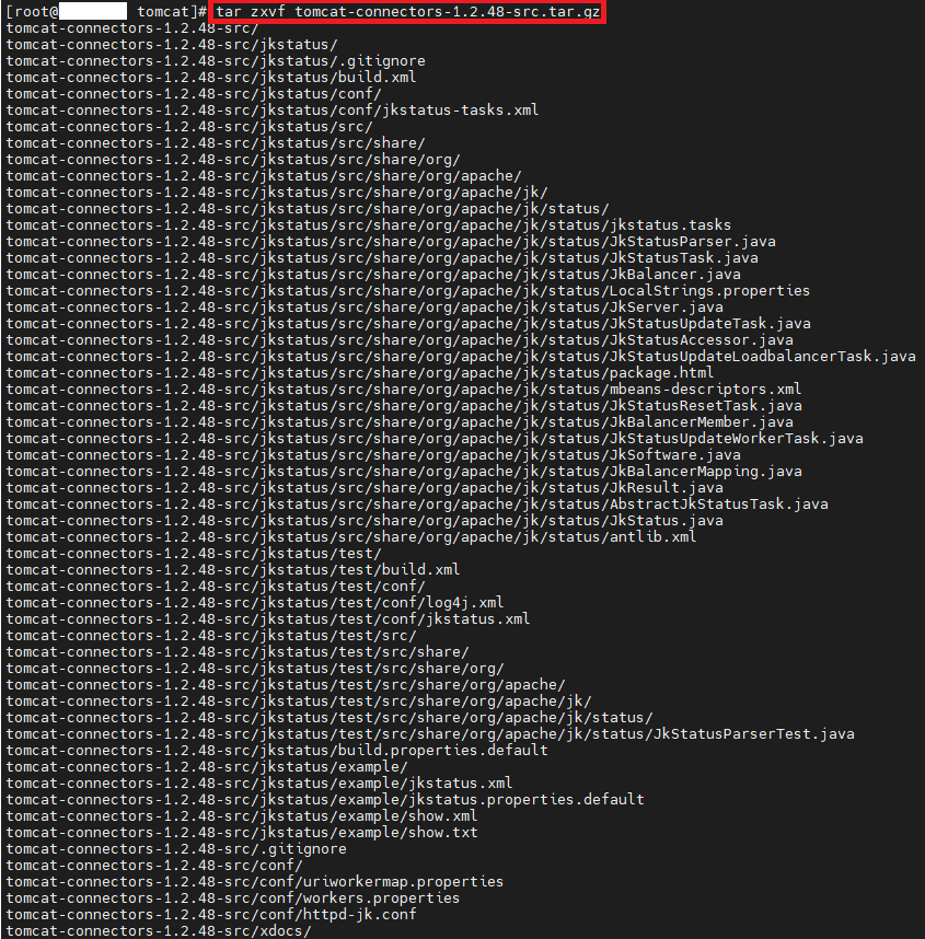 2. 콘솔창에서 'tar zxvf tomcat-connectors-1.2.48-src.tar.gz'를 입력하여 압축을 풉니다.
